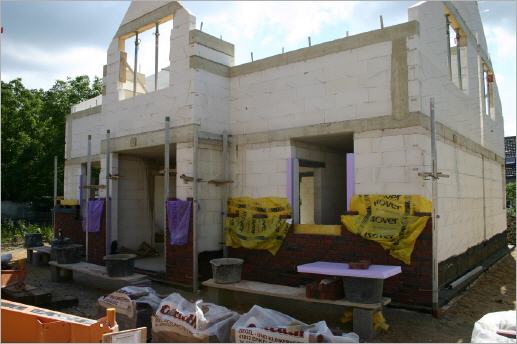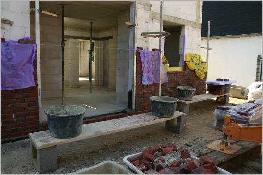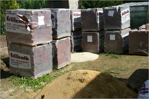 Nun werden doch die Verblendsteine angeliefert und mit den Arbeiten wurde begonnen -- sogar Samstags wird gearbeitet! Wir freuen uns -- aber was ist mit den zwei Wochen "Leerlauf"....?