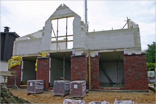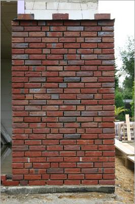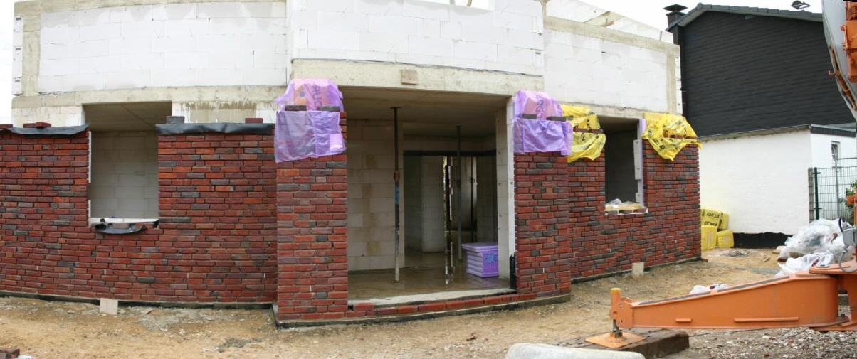 Die Klinkerarbeiten werden fortgesetzt. Mittlerweile sind beide breite Hausseiten im EG verklinkert.