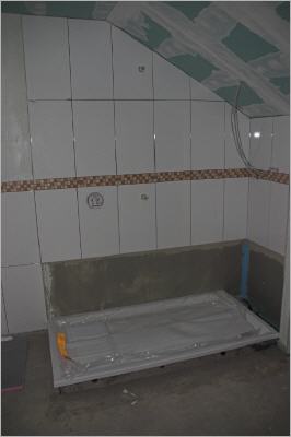 Nachdem der Bau nun einige Zeit beheizt wurde, hat seit sich seit zwei Arbeitstagen der Fliesenleger ans Werk gemacht. Mit der Arbeit und vor allem auch den ausgesuchten Fliesen sind wir sehr zufrieden. Einige Kleinigkeiten müssen allerdings doch korrigiert werden, da wir uns das ein oder andere doch anders vorgestellt haben. Die Haustür ist ebenfalls eingesetzt worden. Noch hat man auf die Glaseinsätze verzichtet und statt dessen Holzfüllungen eingesetzt. Aber zumindest kann nun niemand mehr die wackelige Bautür umpusten... ;-) Die Badewannen und Duschtassen sind ebenfalls angekommen und werden demnächst mit Trockenbau und Fliesen umbaut. Wir sind gespannt, wie es dann aussieht. Die Eckbadewanne und die riesige Duschtasse machen allerdings schonmal eine gute Figur. Die Elektroinstallation wird derzeit auch komplettiert. Die letzten Steckdosen wurden gesetzt und die Glühbirnen montiert. Alles in Allem geht es also gut voran.