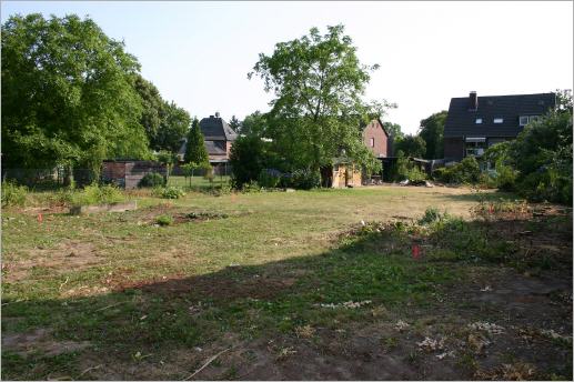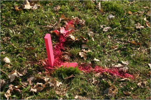 Die Vermesser sind da und markieren die Ausmaße des Hauses mit kleinen Pfählen.