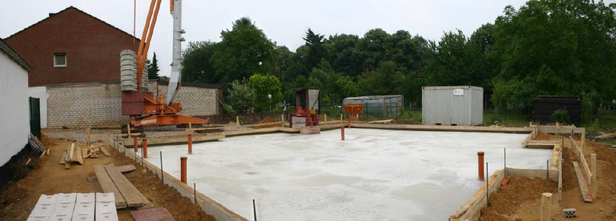 Auch wurde die erste Schicht der Bodenplatte gegossen. Die Rohre für das Abwasser wurden bereits eingesetzt.