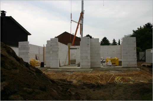 Da ist man mal einen Tag nicht auf der Baustelle, da mauern die Arbeiter glatt das ganze Erdgeschoss! Wow! Toller Anblick -- wir standen zum ersten Mal im Wohnzimmer und konnten aus dem Fenster schauen.