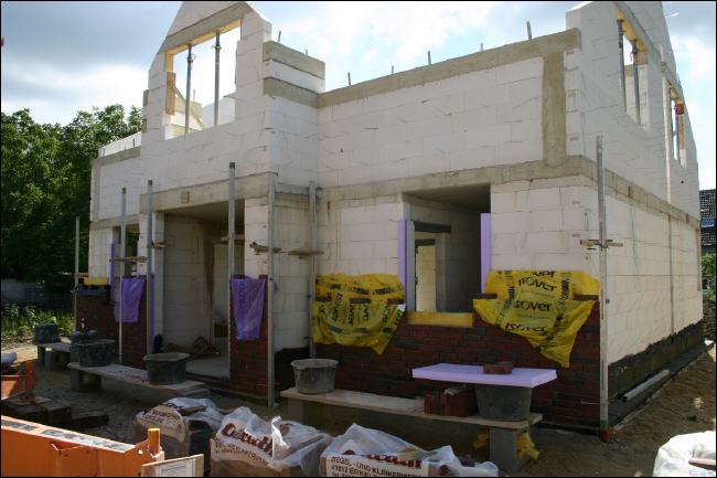 Nun werden doch die Verblendsteine angeliefert und mit den Arbeiten wurde begonnen -- sogar Samstags wird gearbeitet! Wir freuen uns -- aber was ist mit den zwei Wochen "Leerlauf"....? |