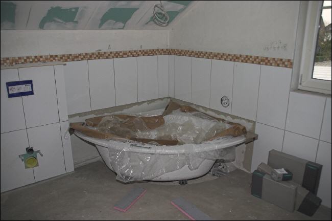 Nachdem der Bau nun einige Zeit beheizt wurde, hat seit sich seit zwei Arbeitstagen der Fliesenleger ans Werk gemacht. Mit der Arbeit und vor allem auch den ausgesuchten Fliesen sind wir sehr zufrieden. Einige Kleinigkeiten müssen allerdings doch korrigiert werden, da wir uns das ein oder andere doch anders vorgestellt haben. |