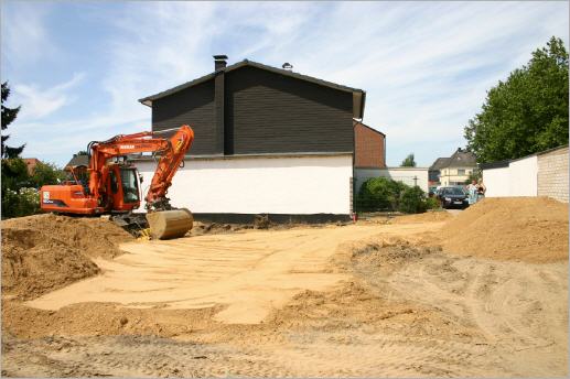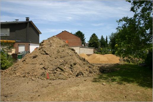 Der Mutterboden wird ca. 50 cm tief ausgehoben und auf dem Grundstück gelagert. In das Loch kommen einige Tonnen Sand, der in Schichten verdichtet wird. Mit dieser "Unterlage" wird der Baukörper auf das Straßenniveau angehoben. Durch unser relativ unebenes Grundstück kommt da schon einiges zusammen.