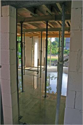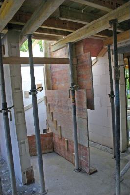 Die Stützbretter und -pfeiler für die Erdgeschossdecke sind montiert worden. Beide Kamine stehen, allerdings fehlt noch immer die Wand zwischen Speisekammer und Gäste-WC. Ein Fehler oder System?