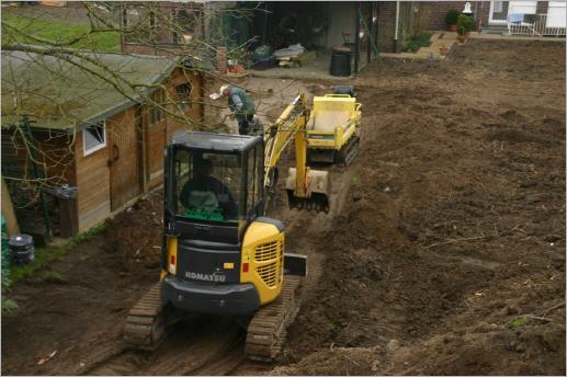 Endlich lässt der Regen nach und die Firma B. beginnt mit dem Gartenbau.