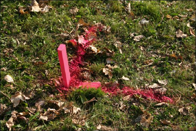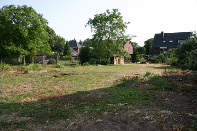 Die Vermesser sind da und markieren die Ausmaße des Hauses mit kleinen Pfählen. |