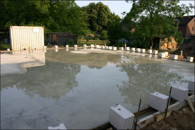 Heute wurde die Bodenplatte fertiggestellt. Wegen des nach wie vor sehr heißen und trockenen Wetters braucht der frische Beton viel Wasser, damit er nicht zu schnell austrocknet. |