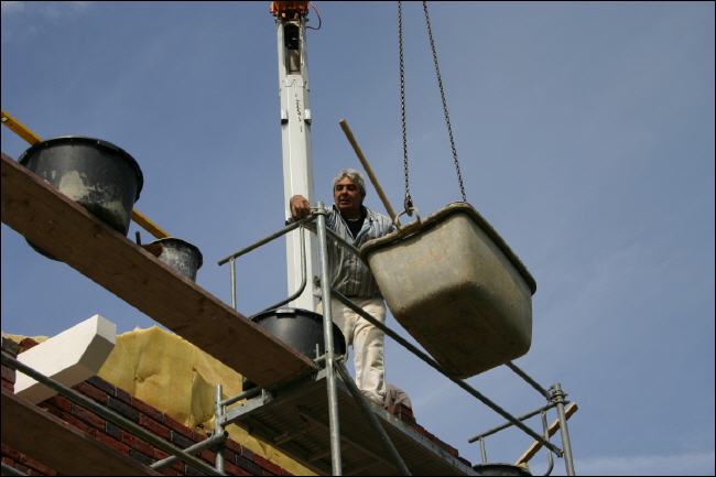 Am diesem Samstag war richtig viel los auf unserer Baustelle! Die Rohbauer hat der Ehrgeiz gepackt (oder der enge Terminplan... *g*) und man hat den sonnigen Tag genutzt, um noch einen der Giebel fertig zu verklinkern. Wir konnten das Geschehen diesmal persönlich einige Zeit beobachten. |
